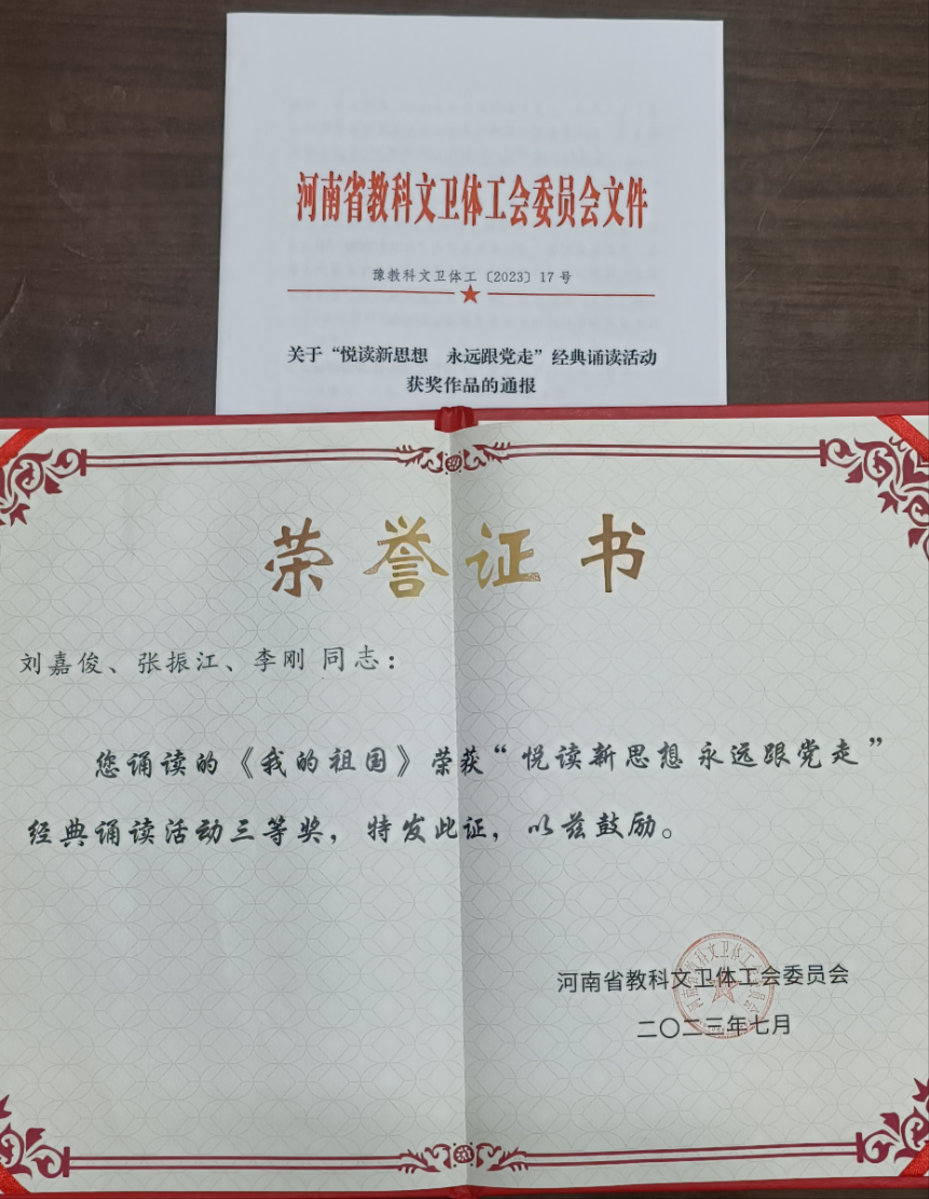 近日,省教科文卫体工会下发了《关于“悦读新思想 永远跟党走”经典诵读活动获奖作品的通报》(豫教科文卫体工〔2023〕17号),我院分工会报送的作品《我的祖国》荣获三等奖。此次经典诵读活动由省教科文卫体工会主办,旨在激励全省教科文卫体系统广大职工凝心聚力、砥砺奋进,为全面建设现代化河南、谱写新时代中原更加出彩的绚丽篇章贡献智慧和力量。按照活动要求,我院分工会精心组织,广大教师积极参与,报送优秀视频作品...[详细]