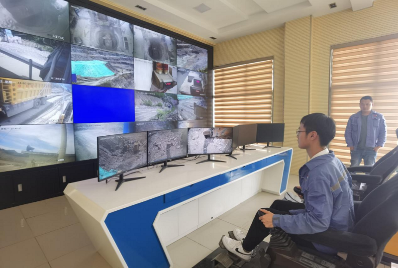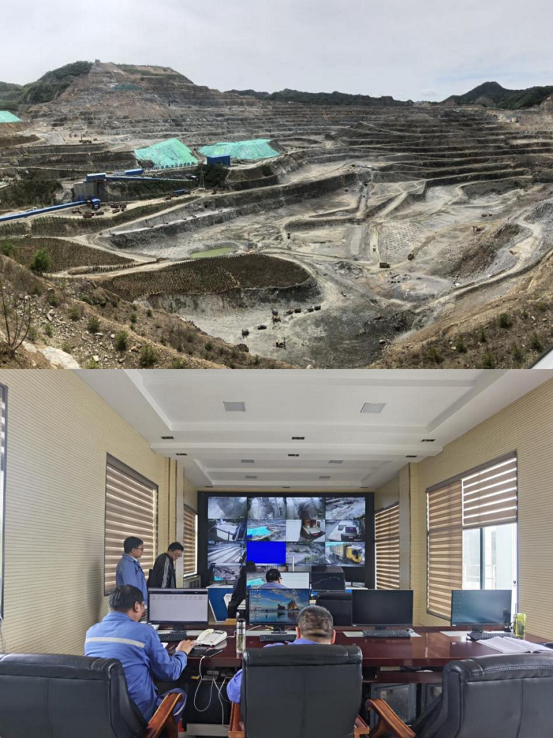 洛阳钼矿无人驾驶车辆工作现场与中控系统操作车间图(摄影/陈振雷)