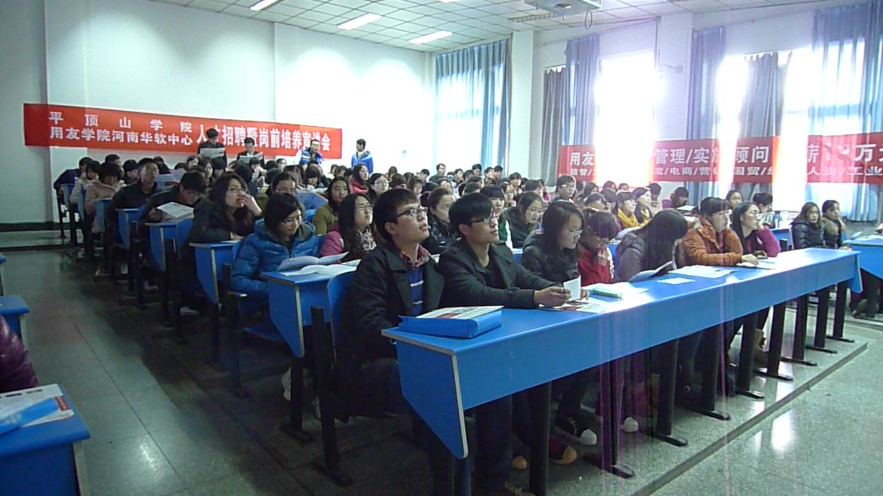 为了给即将迈入社会的毕业生提供更多的就业指导,给他们提供一个就业平台,经济与管理学院于2013年12月12日下午2点在1106教室举办用友公司专场招聘会。此次招聘会的主讲人为用友公司新道分河南分公司省人力资源总监郭浩云和公司负责人王丽,经济与管理学院院长李玉良,辅导员赵明跃老师出席招聘会场。经济与管理学院300余名学生参加此次找招聘会。