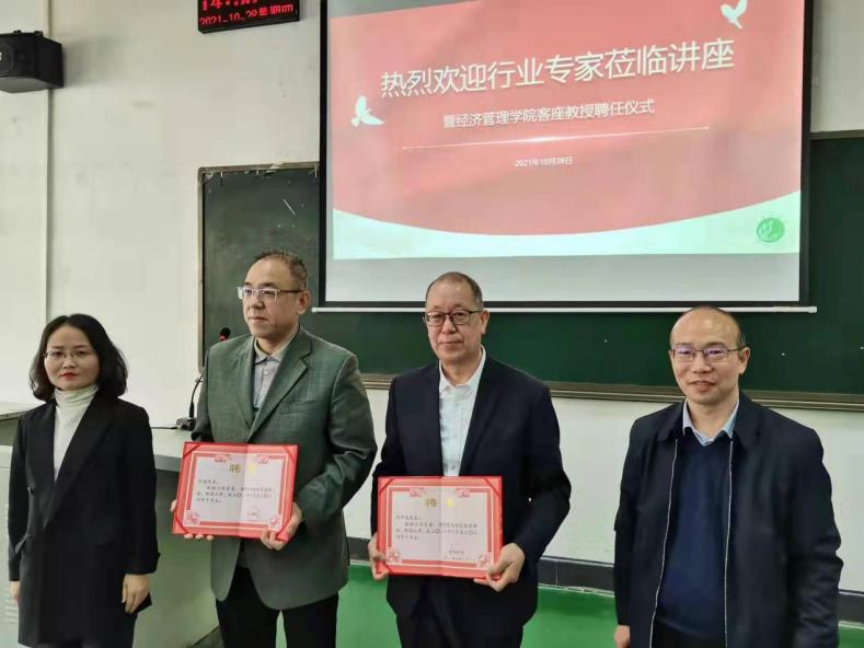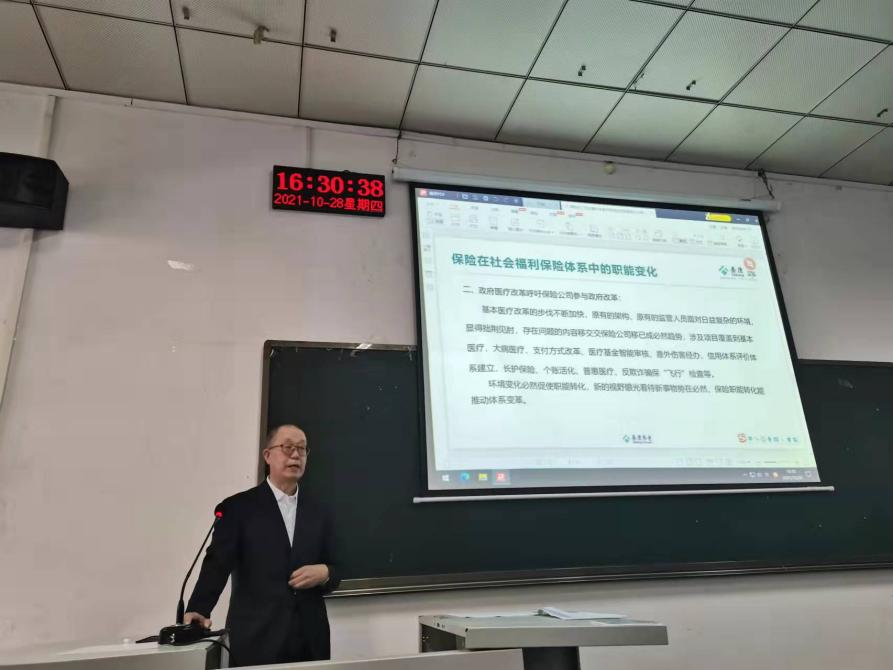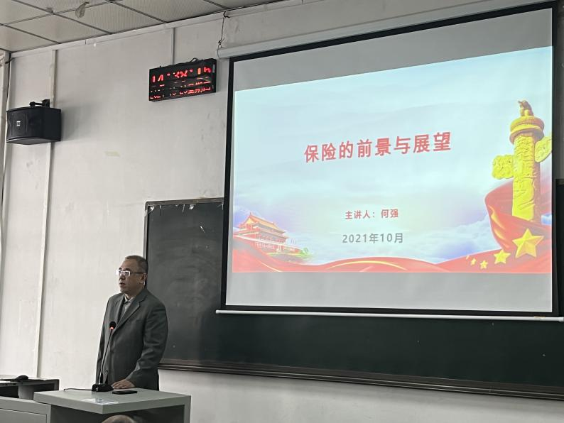 2021年10月28日下午,william威廉英国邀请行业专家平顶山市保险行业协会秘书长何强、泰康养老保险公司平顶山区域中心总经理郑中生来校讲学。william威廉英国院长张振江、副院长杨玉敬、保险学教研室全体教师及保险学专业近120名学生参加了此次活动。