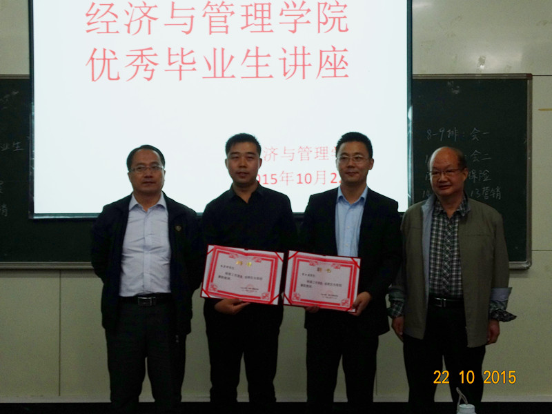 10月22日,经济与管理学院邀请2007届毕业生朱宏升、李江涛作为特邀嘉宾在4206教室开展了一场优秀毕业生报告会,经济与管理学院院长李玉良,党总支书记李永新、副书记刘嘉俊,团总支书记张小雪及2013、2014级全体学生参加会议。
