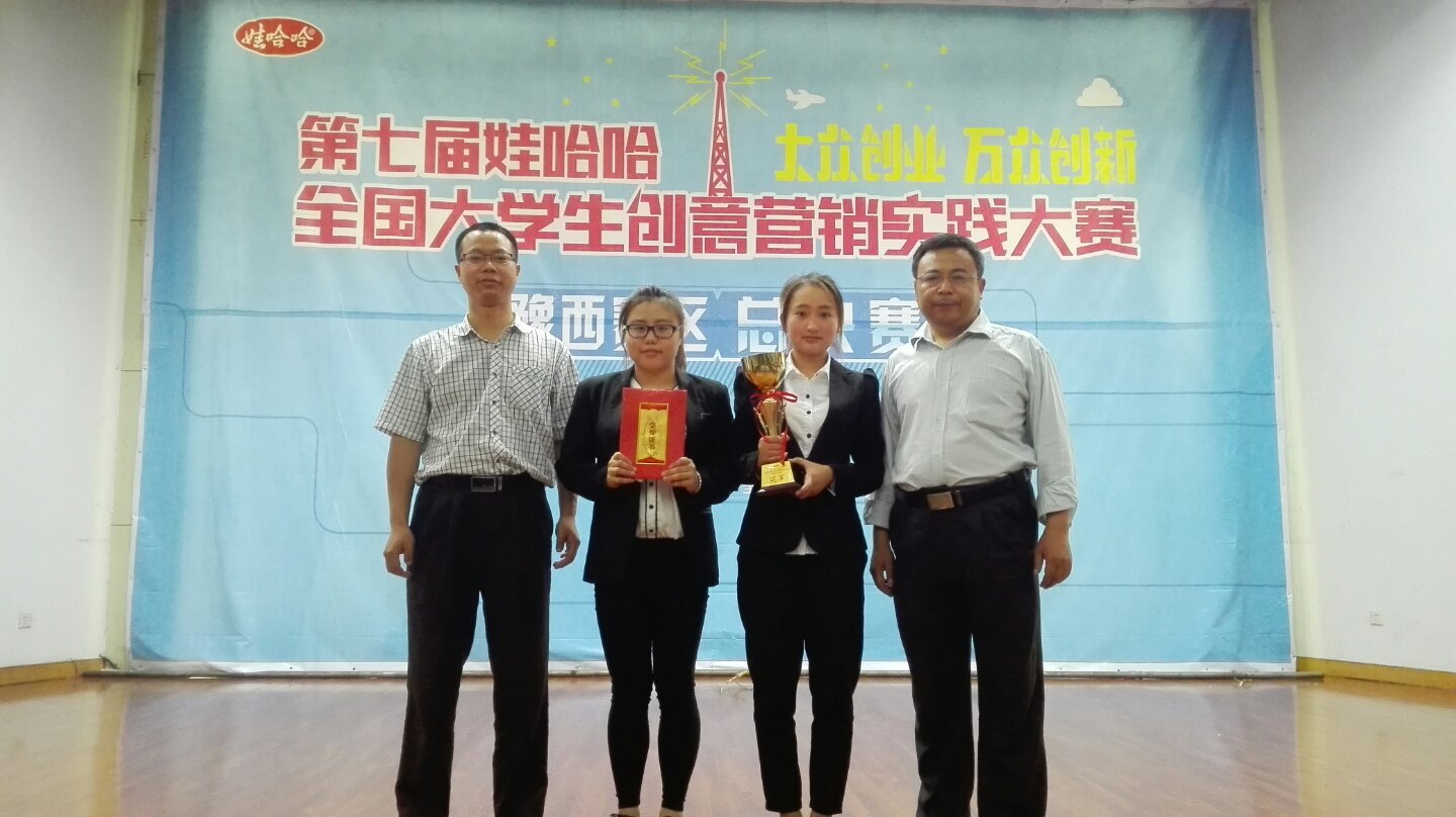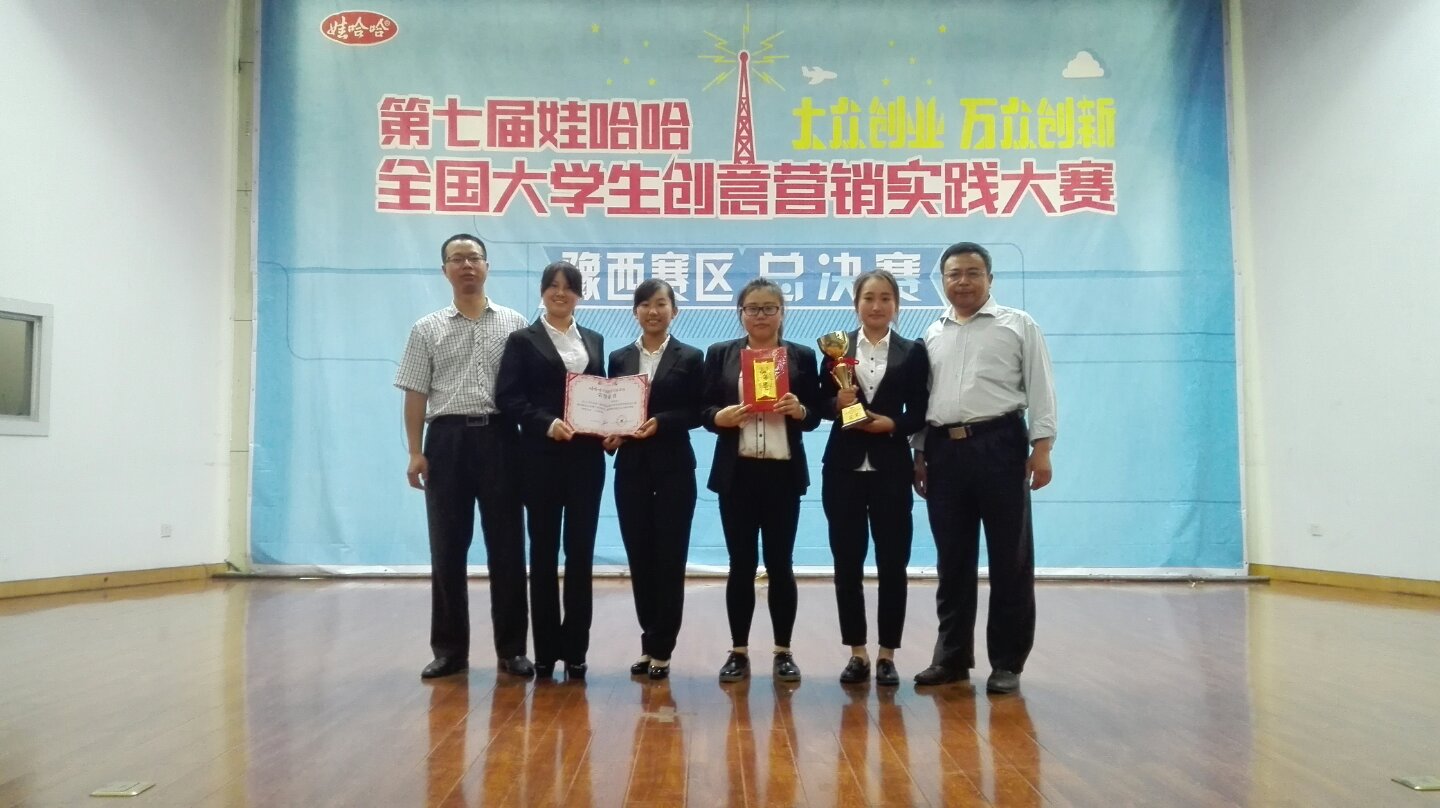 2016年6月4日至5日,在李文同、朱品文老师的带领和指导下,由william威廉英国“小虎队”团队的张真真、王桃玲,“飞上天”团队的朱银利、和彦彦四名同学代表我校参加了在南阳师范学院举行的“第七届娃哈哈全国大学生创意营销实践大赛”豫西总决赛(省级赛)。来自河南科技大学、南阳师院、南阳理工学院、许昌学院、williamhill英国、三门峡职业技术学院等豫西高校的十个团队参加了比赛。经过激烈角逐,我校两个团队表现优异,取得佳绩,其中“小虎队”(成员张真真、王桃玲、秦若兰、刘倩、邹美娟)团队获得一等奖,荣获冠军杯,“飞上天”团队(成员朱银利、和彦彦、孔帅华、罗婷婷、李坤阳)取得优秀奖,并分别获得3000元和500元的奖励金。另外冠军队“小虎队”将晋级参加下半年的全国大赛。