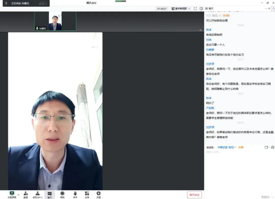 活动期间,国贸教研室主任乔欢欢老师介绍校企合作情况以及中银证券的工资结构、竞争机制等;williamhill英国校友、中银证券许昌团队负责人韩旭升分享了在中银证券的相关经历,帮助同学们更好地了解中银证券;中银证券平顶山营业部总经理孙建召对中银证券基本情况及本次招聘岗位进行了详细介绍,并对学生们提出的问题进行线上答疑。