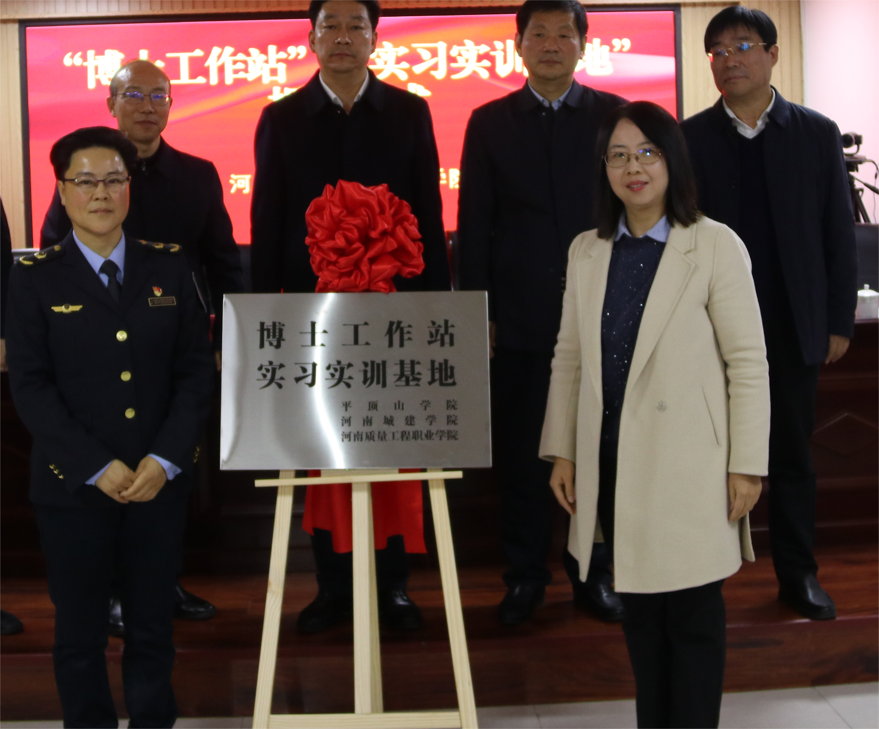 化学与环境工程学院党委书记曹萍与宝丰县市场监督管理局党组书记、局长王晓丽共同为“博士工作站”、“实习实训基地”揭牌。
