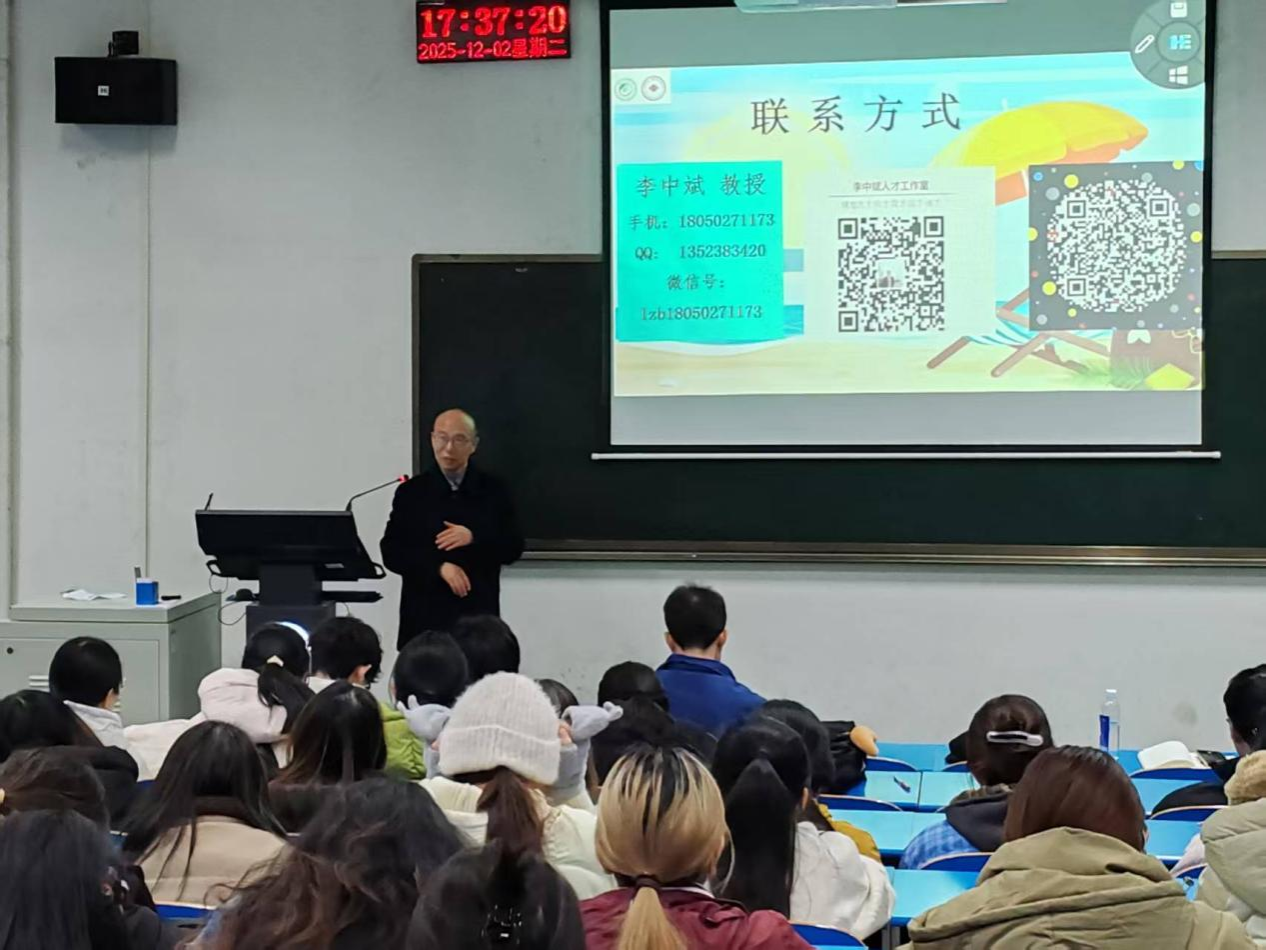 讲座伊始,李中斌围绕“AI赋能时代的人力资源管理动态”展开分享。他指出,随着人工智能技术的深度渗透,人力资源管理正从传统的“事务性处理”向“智能化决策”转型。AI技术不仅提升了招聘、培训、绩效考核等环节的效率,更推动了人才管理理念的革新,从“经验驱动”转向“数据驱动”。李教授强调,未来的HR需既能运用AI工具,又能把握人才的个性化需求。