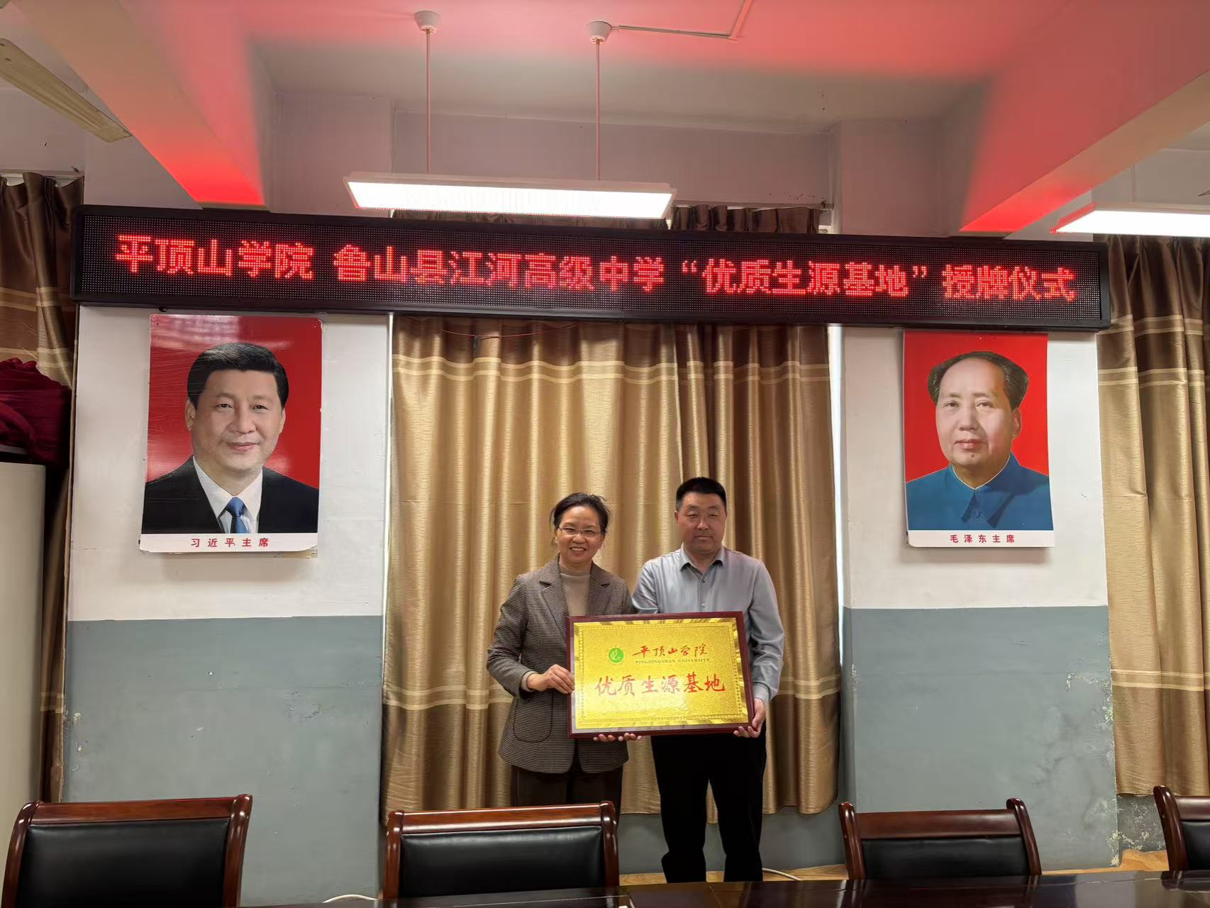 4月3日下午,我院党委书记刘嘉俊、党委副书记李刚一行前往鲁山县江河高中开展招生宣传与优质生源基地授牌活动。