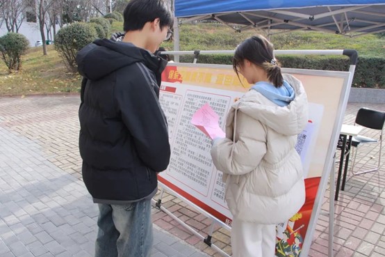 现场征兵宣传展板一一排列展示了最新应征入伍政策信息,“保家卫国终不悔”等宣传标语振奋人心。征兵宣传手册分发到咨询的学生手中,关于服役期限、考学提干、退伍安置等各种问题由国防教育部为大家进行答疑。