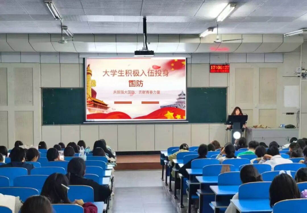 在征兵政策宣讲环节,宣讲人通过PPT演示,深入浅出地讲解国防建设的重要意义,引导同学们认识到“国无防不立,民无兵不安”的深刻内涵。随后,围绕大学生入伍条件、服役期间待遇、退役后升学就业优惠政策等内容展开,并重点对学费补偿、考研加分、公务员定向招录等优待政策深入解读。帮助同学们全面了解参军入伍的具体流程和保障措施。