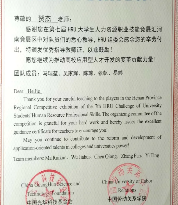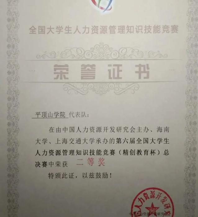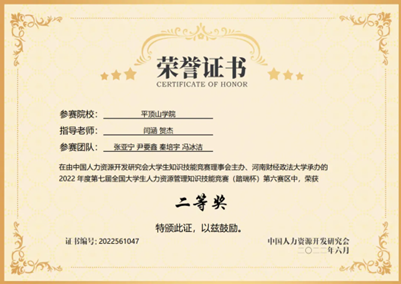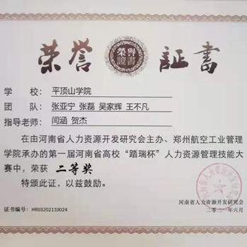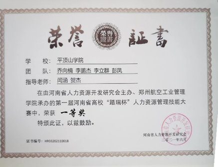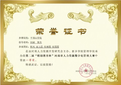 2021年10月我社前社长张亚宁同学带领团队代表学校参加第六届全国大学生人力资源管理知识技能竞赛(精创教育杯)全国总决赛,并荣获二等奖。2022年6月,在路辉同学和彭凤同学的带领下,我社成员所在的一队和二队均在第二届“精创教育杯”河南省人力资源数字化管理大赛中荣获一等奖。由张亚宁同学带领的第三小队在河南省人力资源管理知识竞赛(踏瑞杯)中获得二等奖。