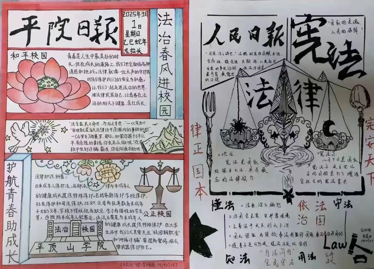 为提高大学生学习法律知识的自觉性和主动性,促进多样化宣传。我院举办了“法治春风进校园,护航青春助成长”主题手抄报创作活动。同学们以生动的图文诠释了宪法精神和法治原则。活动吸引了各班级学生的积极参与,大家以独特的视角和丰富的创意,展现了“尊法、学法、守法、用法”的法治校园文化,营造了浓厚的法治校园文化氛围。