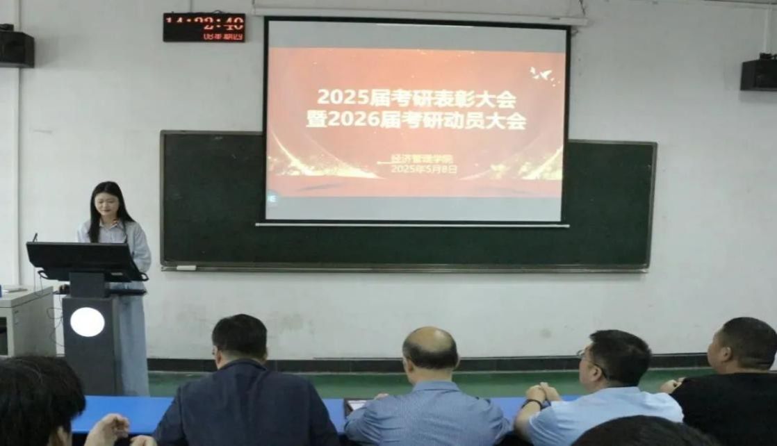最后,张振江作总结发言和考研动员讲话,他围绕“回望奋斗历程、凝聚当下力量、展望未来征程、传承经管精神”四个方面对学院2025年考研工作进行了总结,充分肯定了取得的成绩,并对2026年考研工作进行了全面动员和部署。他指出,本届考研录取人数创历史新高,录取率连续三年稳步攀升,彰显了学院人才培养成效。学院通过项目化导师制、专题讲座、专家辅导及模拟面试等举措全方位支持考研,未来也将继续提供全程支持,并勉励2026届备考学子传承 “经世致用” 传统,以榜样为引领,坚定目标,不懈追求理想,以饱满的热情和坚韧的毅力投入到备考中。