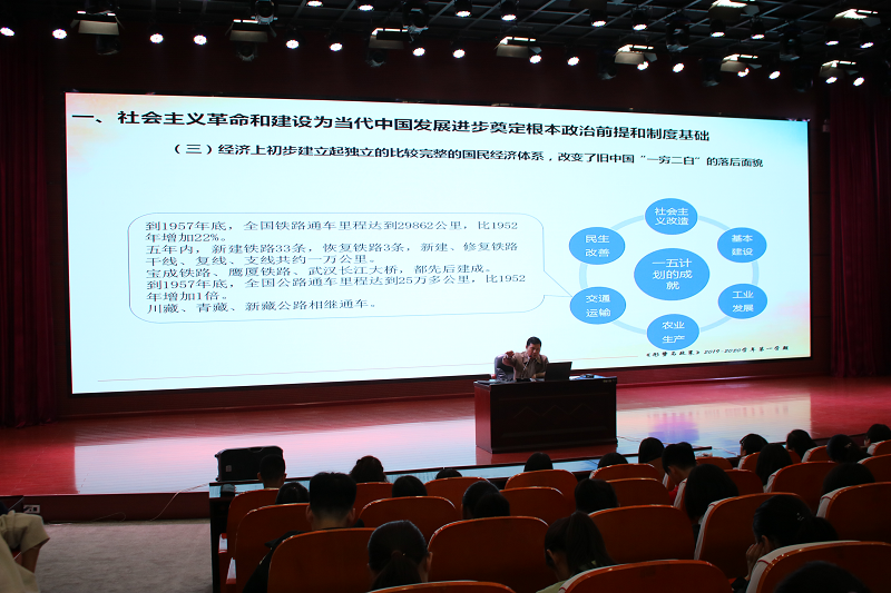 周院长首先通过一段“一名记者镜头里的70年”的短视频展现新中国70年的发展历程,让同学们对我国70年的变化有了直观的感受。周院长指出,在“一穷二白”的基础上建立起来的新中国,要摆脱贫穷落后、走向国家富强、完成民族振兴、实现人民富裕,就必须走社会主义道路。中国共产党团结带领中国人民果断而坚定地推动由新民主主义向社会主义的过渡,实现了中国历史上最深刻最伟大的社会变革。