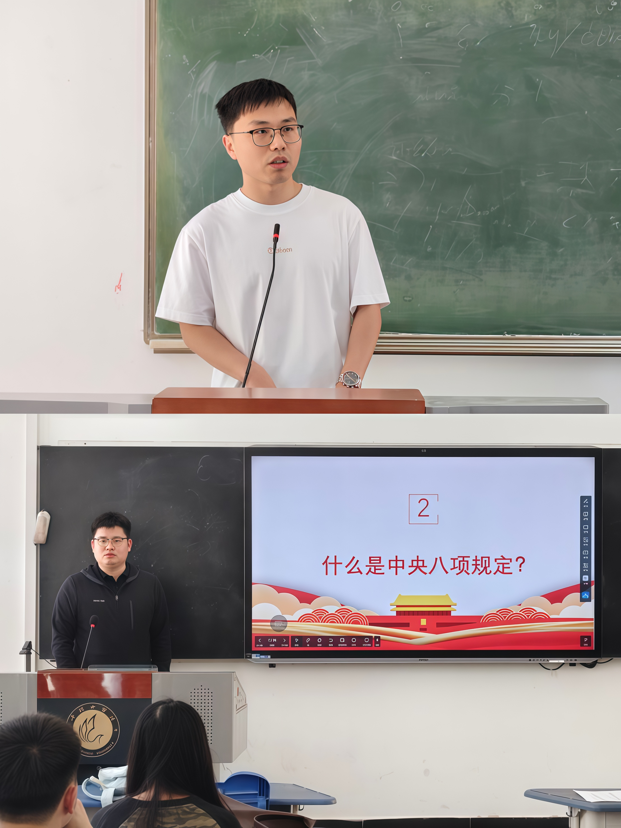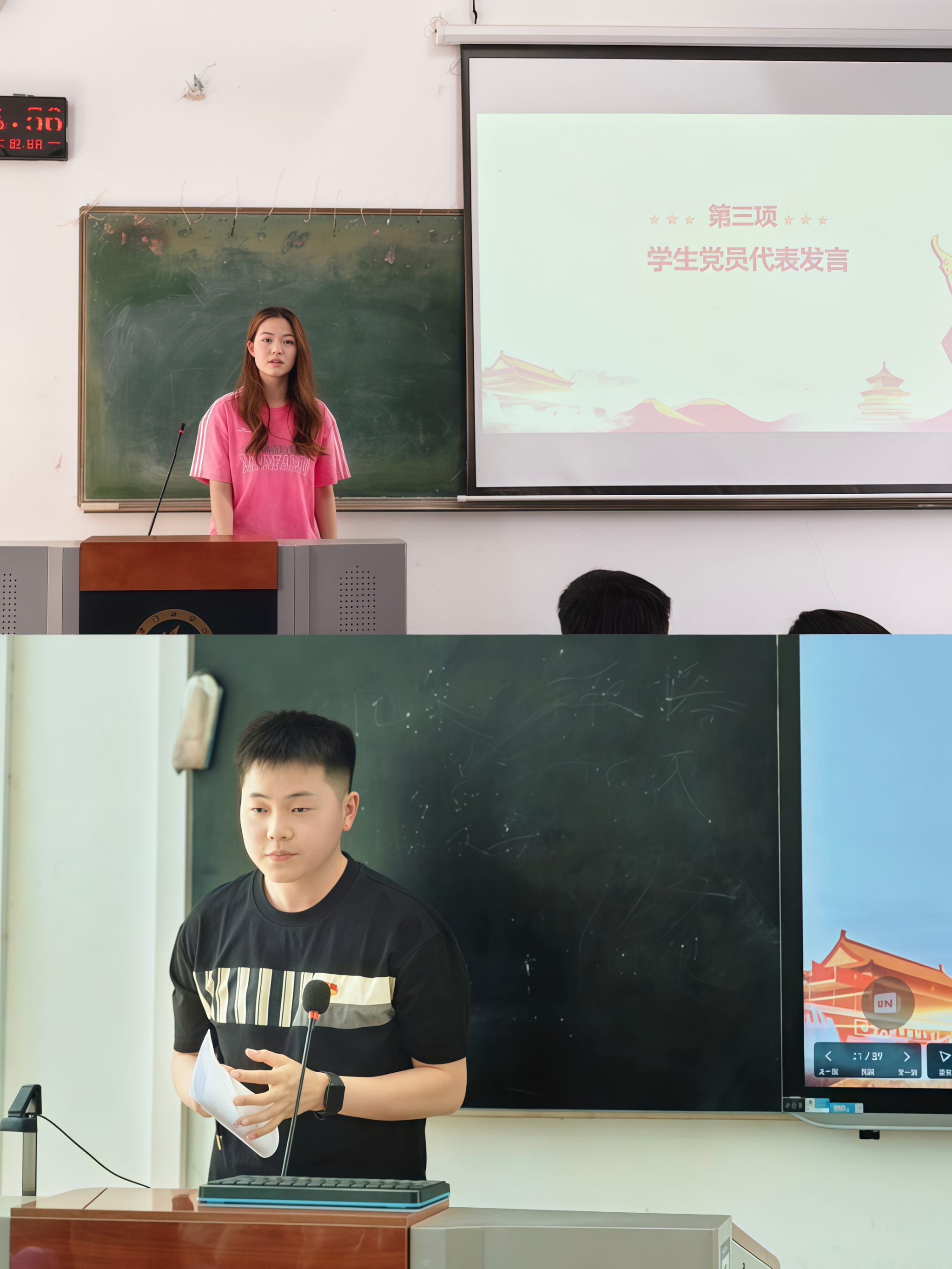 随后,学生党员代表段艺涵同志和高玉晨同志分别发言。段艺涵同志立足学生党员实际,从思想建设与行动实践两方面展开论述。她指出,正风肃纪既是党性锤炼,也是品格塑造。学生党员应在日常学习生活中以党纪为镜,自觉抵制形式主义、官僚主义,充分发挥先锋模范作用,带动身边同学增强纪律意识。高玉晨同志则围绕清朗网络空间建设展开,强调在互联网快速发展的当下,网络已成为意识形态斗争的重要阵地。学生党员要提高政治站位,增强网络安全意识,提升信息辨别能力,主动传播正能量,弘扬社会主义核心价值观。